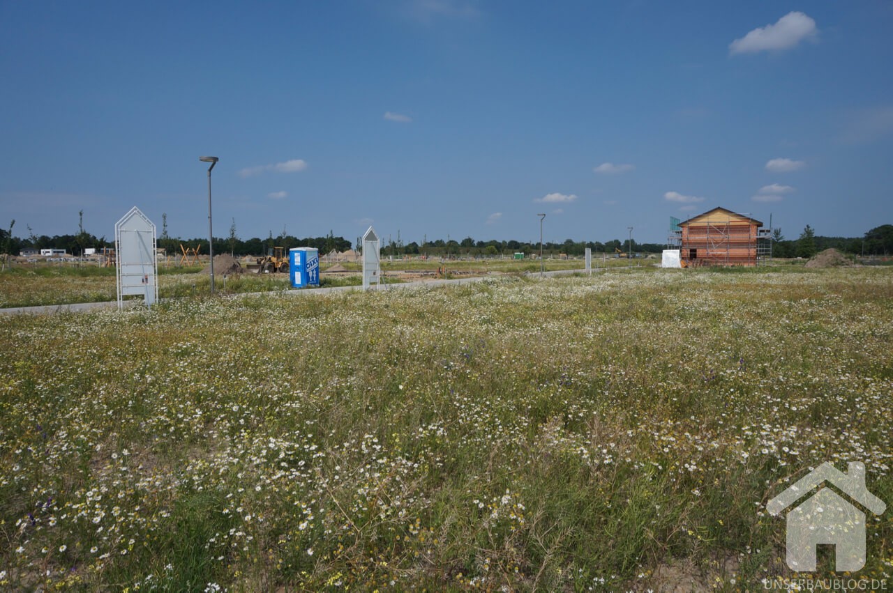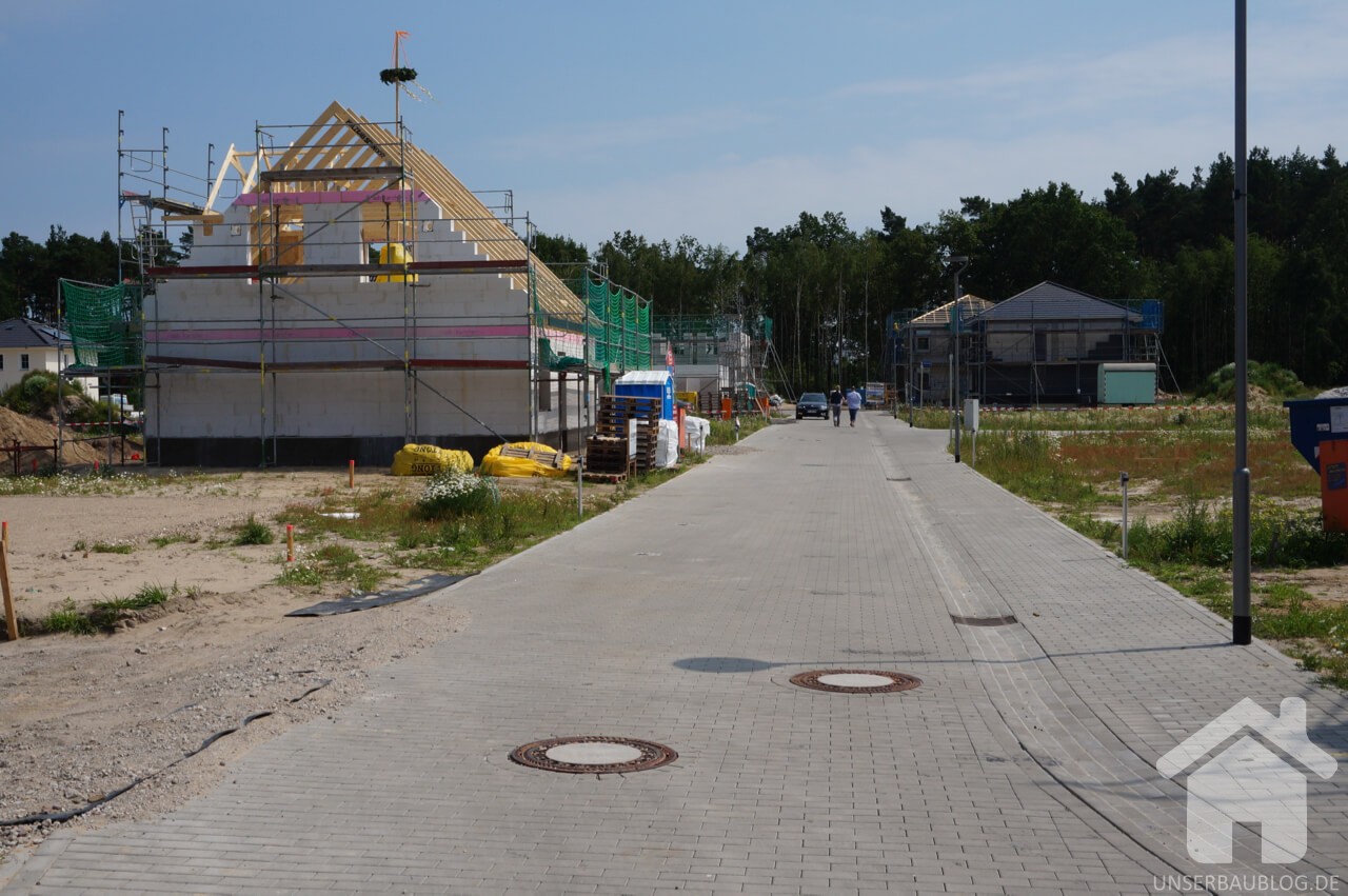 Ein Massivhaus hat nun augenscheinlich das Fertighaus bezüglich der Fassadenarbeiten überholt. Zumindest ist inzwischen dessen Gerüst abgebaut worden, während „das erste Haus am Platze„, welches bereits Mitte Mai aufgestellt wurde noch eingerüstet ist.