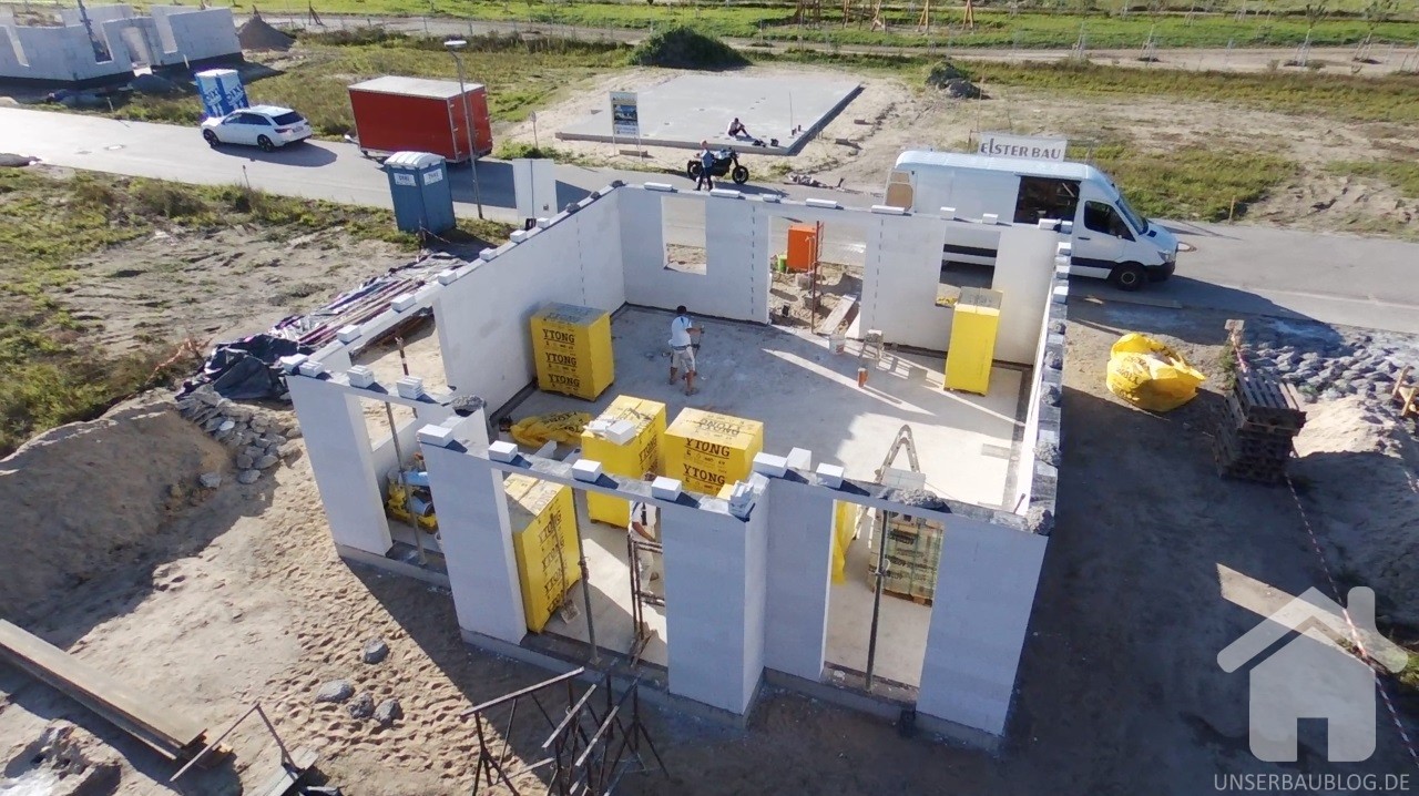 Nur einen weiteren Arbeitstag später, stehen die Außenwände des Erdgeschosses. Und schon wieder änderte sich die Wahrnehmung des künftigen Hauses.